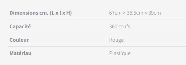 La boîte de transport d’œufs peut contenir 180 œufs et peut être utilisée avec 6 plateaux de 30 œufs.