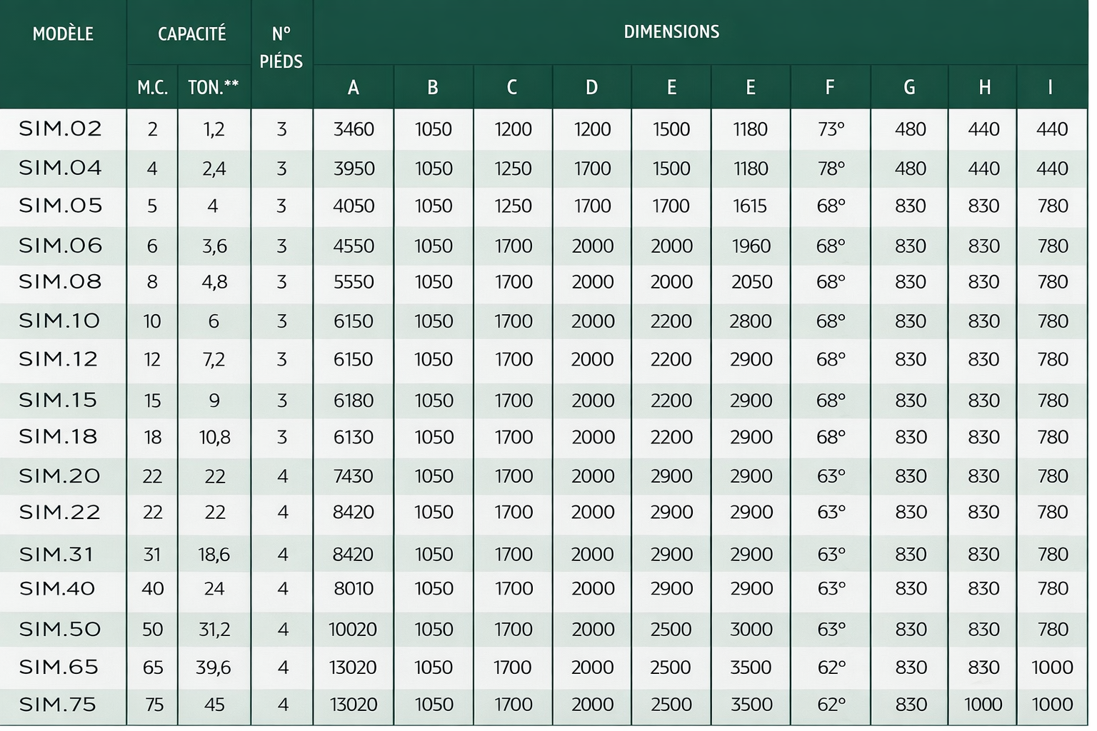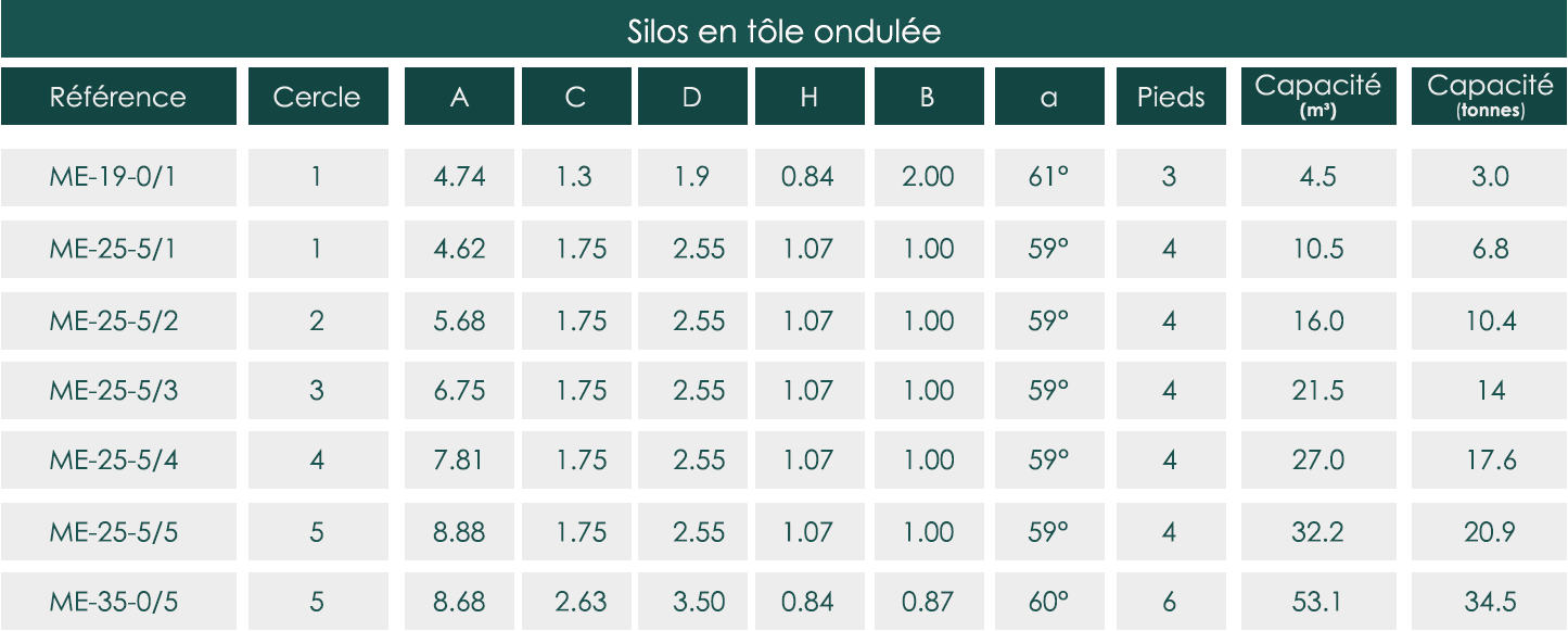 Les silos sont assemblés sur 3, 4 ou 6 pieds selon leur capacité, et sont équipés d’une trémie métallique ainsi que d’une échelle avec cage de protection.