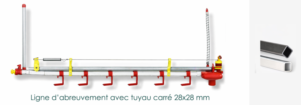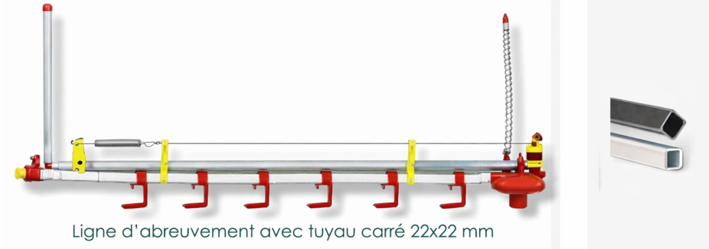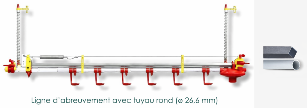 Ligne d’abreuvement automatique au sol pour volailles. La ligne est destinée aux élevages pour l’abreuvement des volailles élevées au sol, en systèmes intensifs ou en plein air.