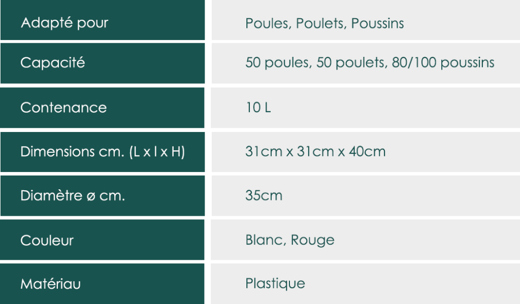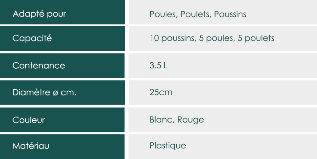 idéale pour : Poussin, Poulet de chair, Coq, Pondeuses