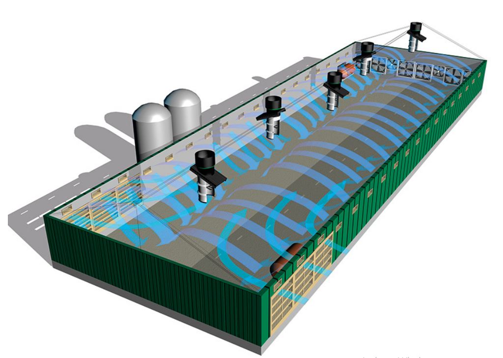 Le système ajuste en permanence la ventilation en fonction de l’humidité intérieure, des conditions climatiques extérieures et du poids des animaux, garantissant un environnement stable et sain tout au long de l’année.