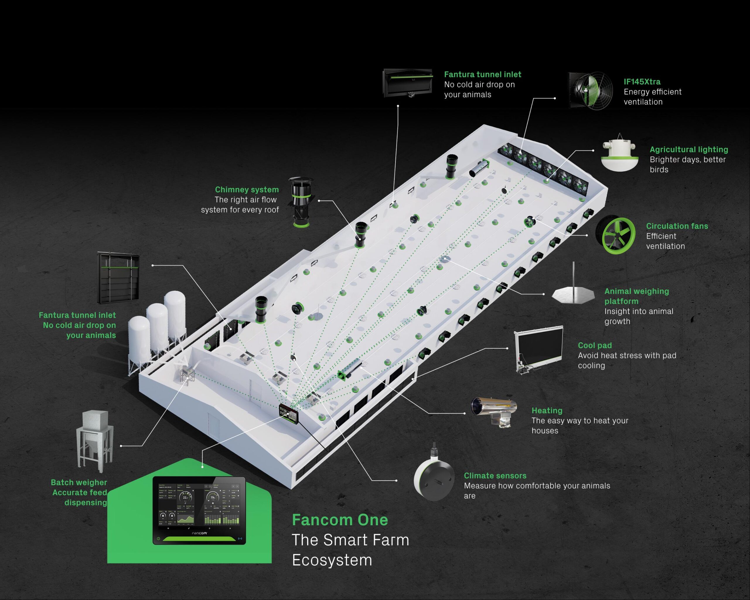 Fancom One combine des technologies intelligentes et des systèmes de contrôle des processus afin de créer des conditions de vie optimales pour vos animaux, tout en vous offrant, à vous l’éleveur, un contrôle total et une efficacité maximale.